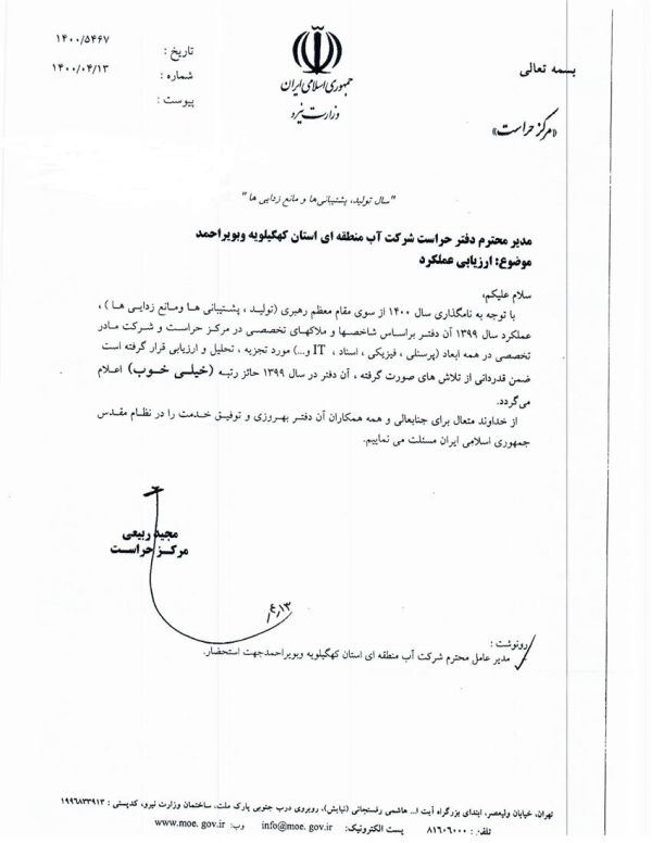 به گزارش روابط عمومی شرکت آب منطقه ای کهگیلویه و بویراحمد، عبدالمنان دانشی، مدیر دفتر حراست شرکت آب منطقه ای استان، با بیان این خبر، اظهار داشت: بر اساس شاخص ها و ملاک های تخصصی در مرکز حراست و شرکت مادر تخصصی در همه ابعاد(پرسنلی، فیزیکی، اسناد، IT و ...) مورد تجزیه، تحلیل و ارزیابی قرار گرفته است که خوشبختانه، دفتر حراست شرکت آب منطقه ای استان حائز رتبه ارزشمند خیلی خوب شده است.
