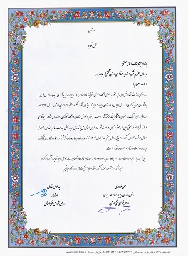 بدینوسیله به پاس این زحمات ارزنده، از جنابعالی، مدیران و معاونان، مهندسان ناظر و کارشناسان و سایر عوامل مرتبط تقدیر و تشکر می گردد. امید آنکه در راه توسعه و عمران کشور و استان شاهد موفقیت های روزافزون باشیم."